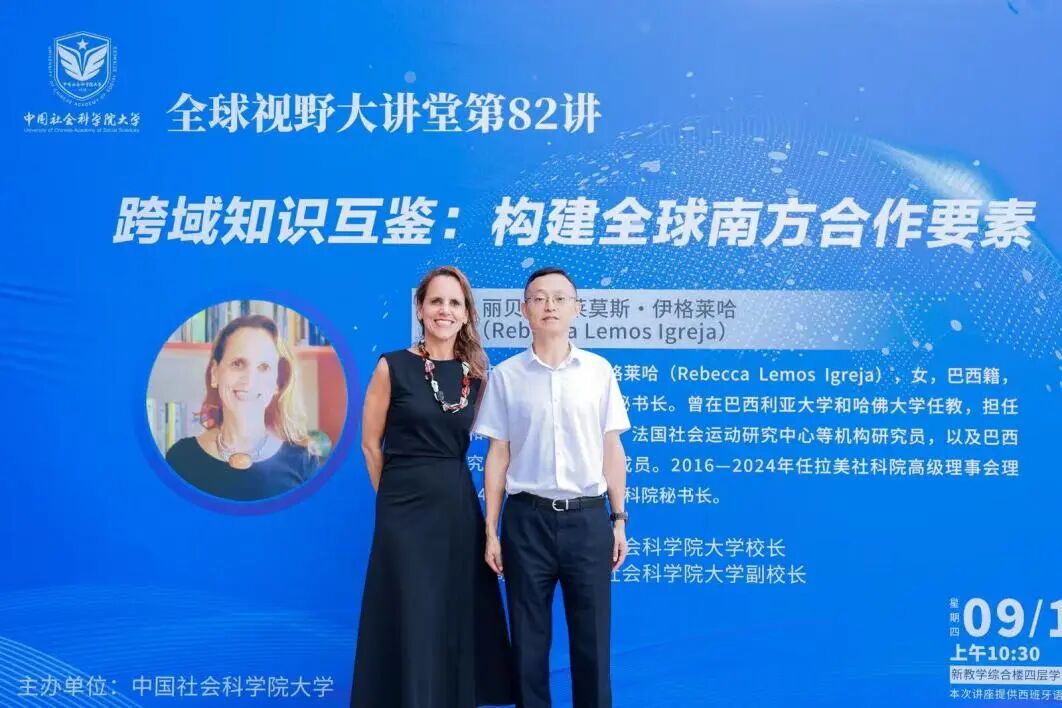 2025年9月11日,中国社会科学院大学“全球视野大讲堂第82讲”于良乡校区教学综合楼四层学术报告厅成功举办。学校特别邀请拉美社科院秘书长丽贝卡·莱莫斯·伊格莱哈(Rebecca Lemos Igreja)来校作学术讲座。我校党委书记胥锦成陪同来宾参观了科技考古与文化遗产保护重点实验室并进行会谈。中国历史研究院副院长、中国考古博物馆馆长、重点实验室主任、首席专家刘国祥陪同讲解。校长张政文出席学术讲座并致欢迎辞,副校长高文书主持讲座。