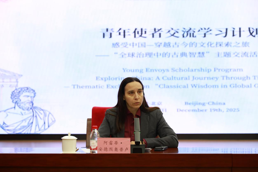 希腊青年访华研学团教师代表阿雷蒂·安德烈奥普卢和缇娜·卡兰佐普卢分别致辞。阿雷蒂·安德烈奥普卢表示,中希均拥有悠久历史,对自身历史文化的保护、尊重与深刻理解,是两国发展的根基,也为全球治理提供古典智慧滋养。她强调,艺术作为古典文化的重要载体,在全球治理中发挥着关键作用。音乐、文学等艺术形式承载价值与身份认同,能跨越语言和意识形态障碍,搭建国家间沟通桥梁,培育相互尊重、促进对话,为全球治理注入人文力量,助力构建更具包容性的可持续未来。缇娜·卡兰佐普卢指出,史前人类的生存智慧是古典智慧的重要组成,其包含的互惠共享、适应韧性、长远规划三大核心原则,可为当下应对全球挑战提供古老借鉴。她强调,这些源自史前的古典智慧,是人类共同体存续的重要根基,对破解当前全球治理难题具有现实意义。同时提及,人文社科领域的探索能滋养精神伦理,为全球治理背后的文明共识提供支撑,凸显古典智慧在当代的持久价值。