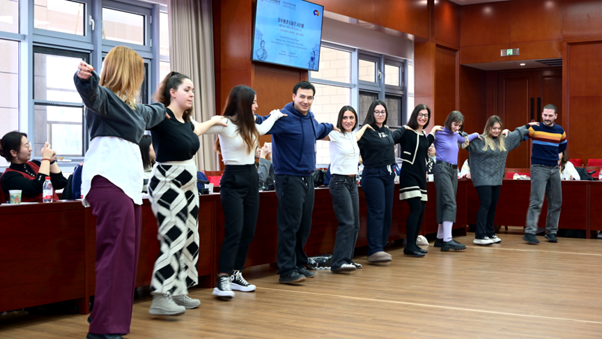 希腊研学团也展示了独具特色的传统舞蹈。表演结束后,希腊同学邀请社科大学生体验基本舞蹈动作。互动中,希腊同学肩搭着肩,耐心地向社科大同学示范舞步。当音乐响起,双方青年肩搭着肩,围成一个跃动的圆环,随着节奏整齐起舞,现场洋溢着热烈而欢快的气氛。