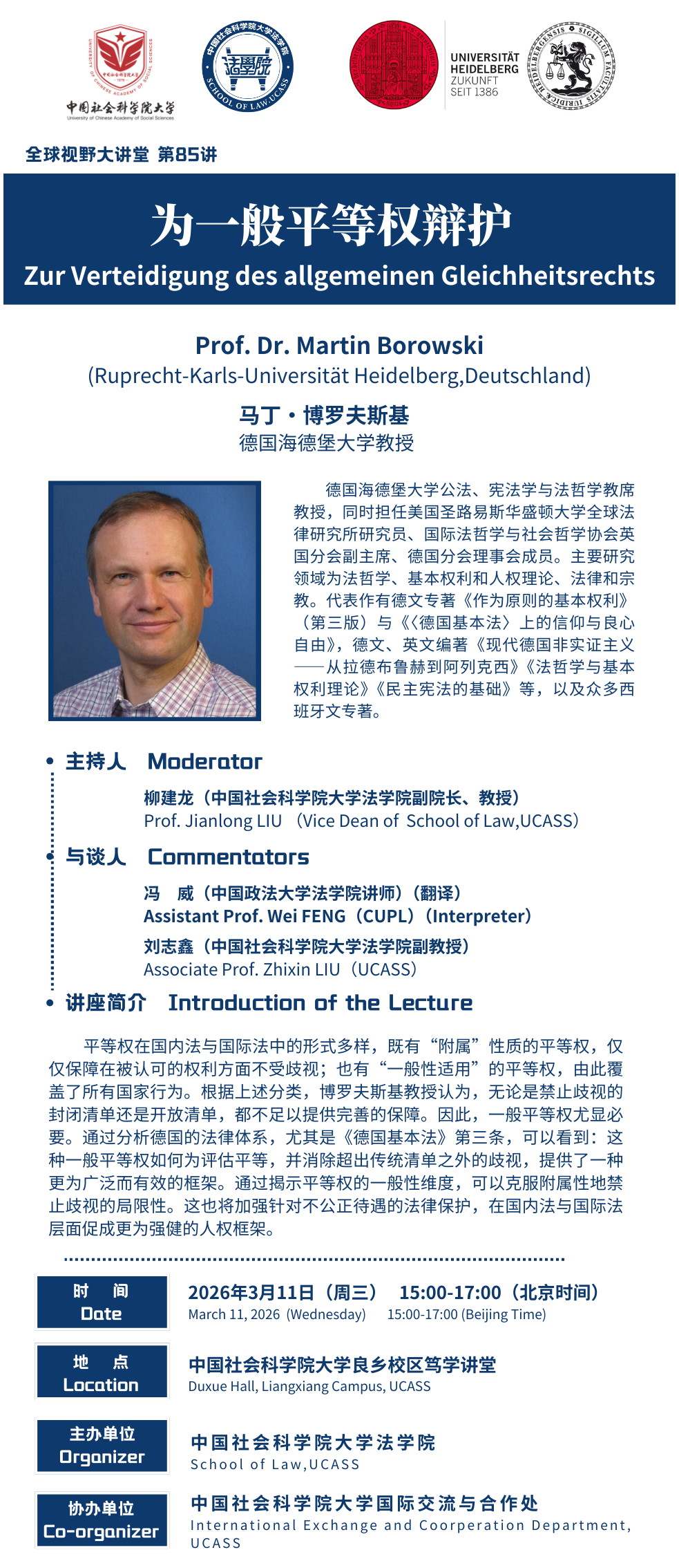 为进一步拓宽我校师生的全球视野,促进人才培养模式的多元化,学校开展“全球视野大讲堂”系列讲座活动。2026年3月11日(星期三)下午15:00,学校邀请海德堡大学教授马丁·博罗夫斯基(Martin Borowski)到校做讲座。欢迎大家积极参加!