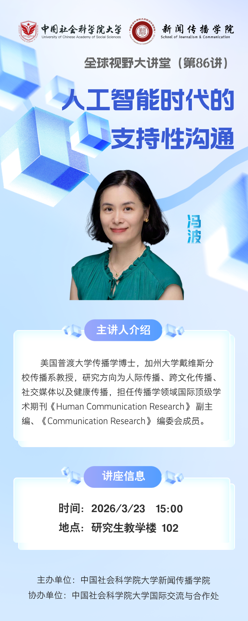 为进一步拓宽我校师生的全球视野,促进人才培养模式的多元化,学校开展“全球视野大讲堂”系列讲座活动。2026年3月23日(星期一)15:00,加州大学戴维斯分校传播系教授冯波来校做讲座。欢迎大家积极参加!