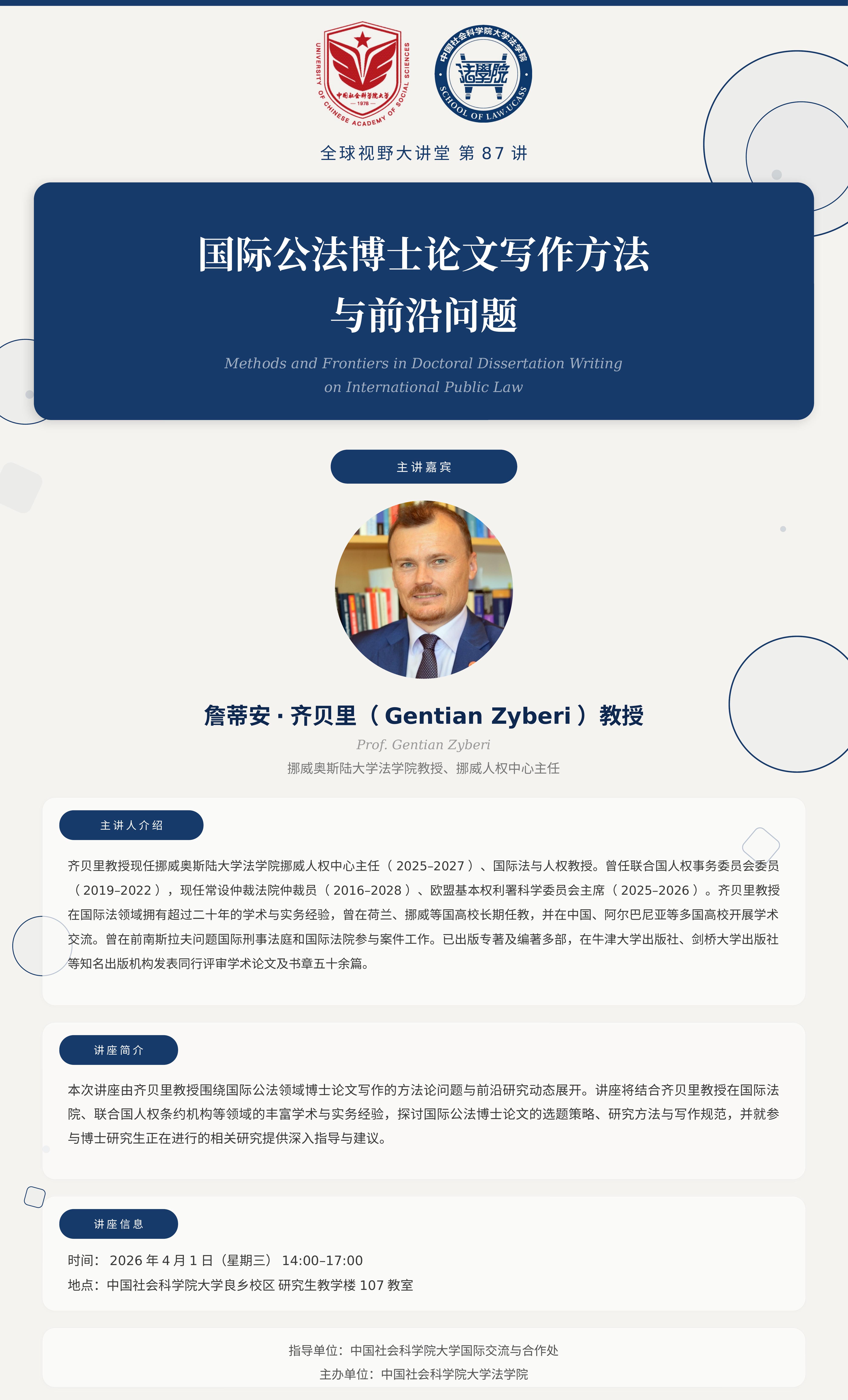 为持续拓宽我校师生的全球视野,促进人才培养模式的多元化,学校开展“全球视野大讲堂”系列讲座活动。2026年4月1日(星期三)14:00,挪威奥斯陆大学法学院教授詹蒂安·齐贝里(Gentian Zyberi)来校做讲座。欢迎大家积极参加!