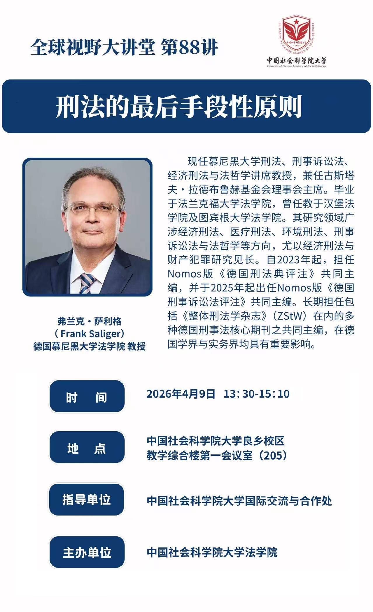 为持续拓宽我校师生的全球视野,促进人才培养模式的多元化,学校开展“全球视野大讲堂”系列讲座活动。2026年4月9日(星期四)13:30,慕尼黑大学法学院教授弗兰克·萨利格(Frank Saliger)来校做讲座。欢迎大家积极参加!